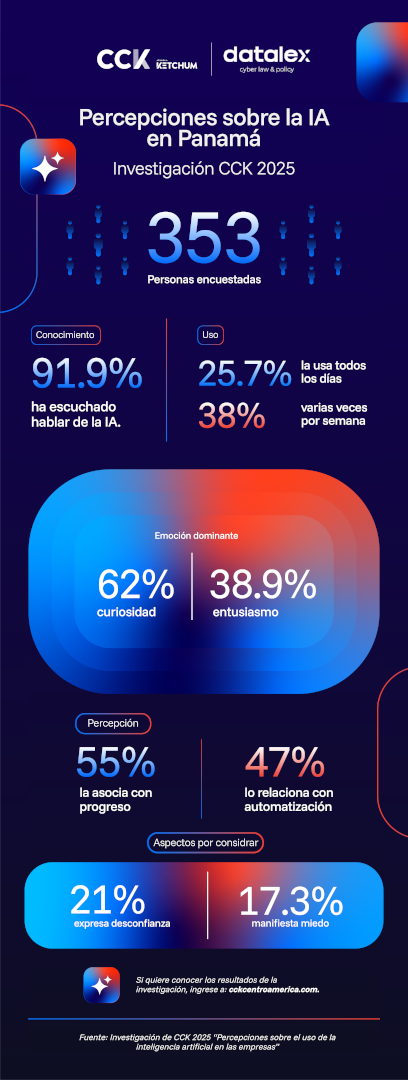 La investigación regional “Percepciones del uso de la inteligencia artificial en las empresas”, desarrollada por CCK Centroamérica en alianza con Datalex Latam, recopiló la opinión de 2.275 personas con perfil técnico y universitario en siete países, revelando que, en Panamá, la adopción de IA avanza con entusiasmo, aunque persiste una confianza empresarial aún en construcción.