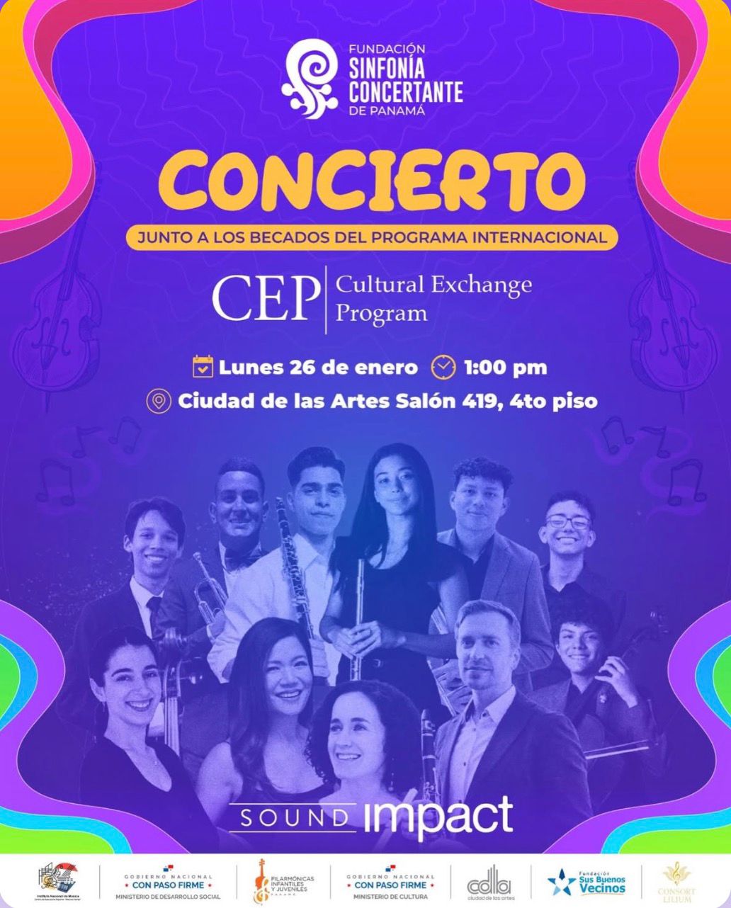 El primer concierto del campamento será hoy junto a los becados del Programa Internacional Cultural Exchange Program (CEP) de Sound Impact, a las 1:00 p.m. en el salón 419 de La Ciudad de las Artes. Con los artistas internacionales Danielle Cho (Violonchelo) de Estados Unidos, Kayla Moffet (Violín) de Estados Unidos y Sarah Frisof (Flauta) de Estados Unidos y Antonello Dimatteo (Clarinete) de Italia.