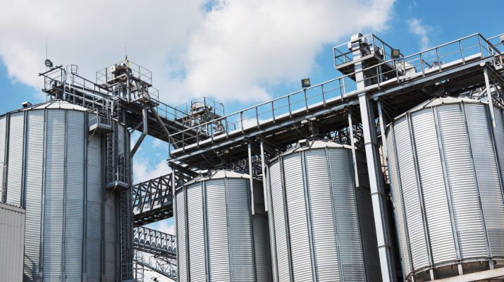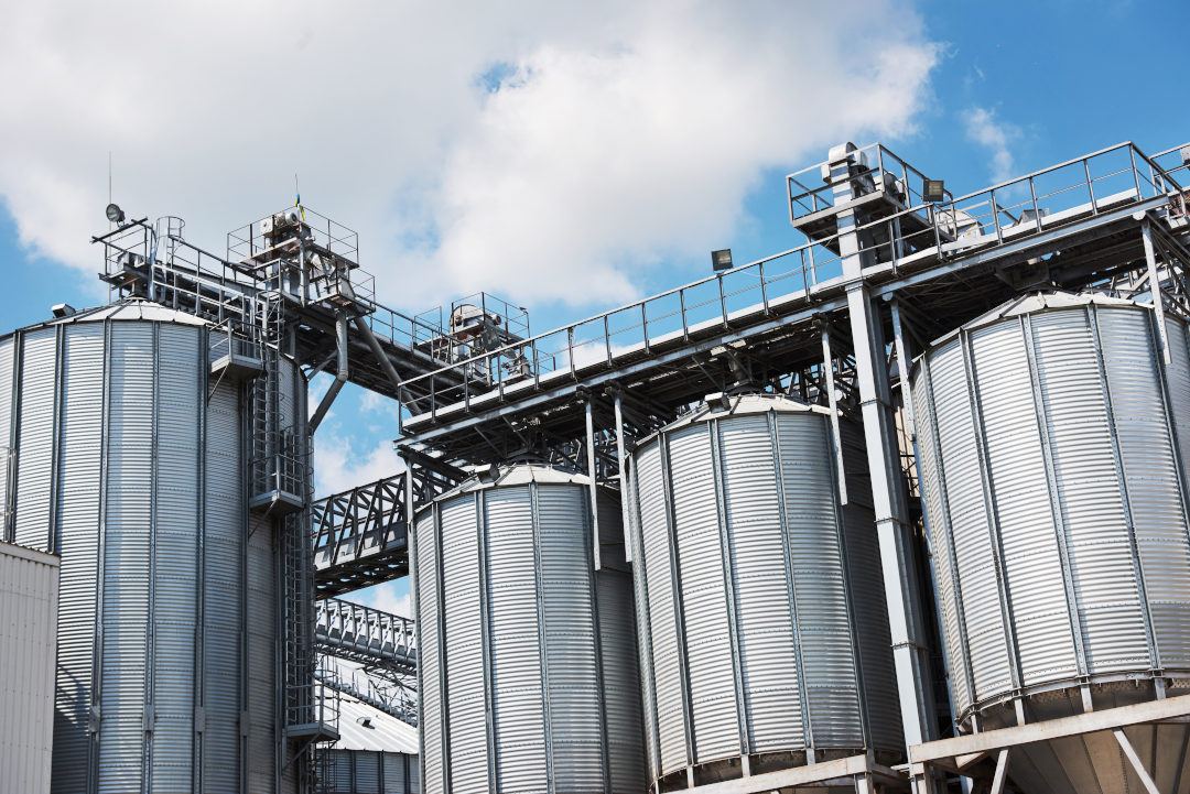 Agricultural Silos. Building Exterior. Storage and drying of grains, wheat, corn, soy, sunflower against the blue sky with white clouds.