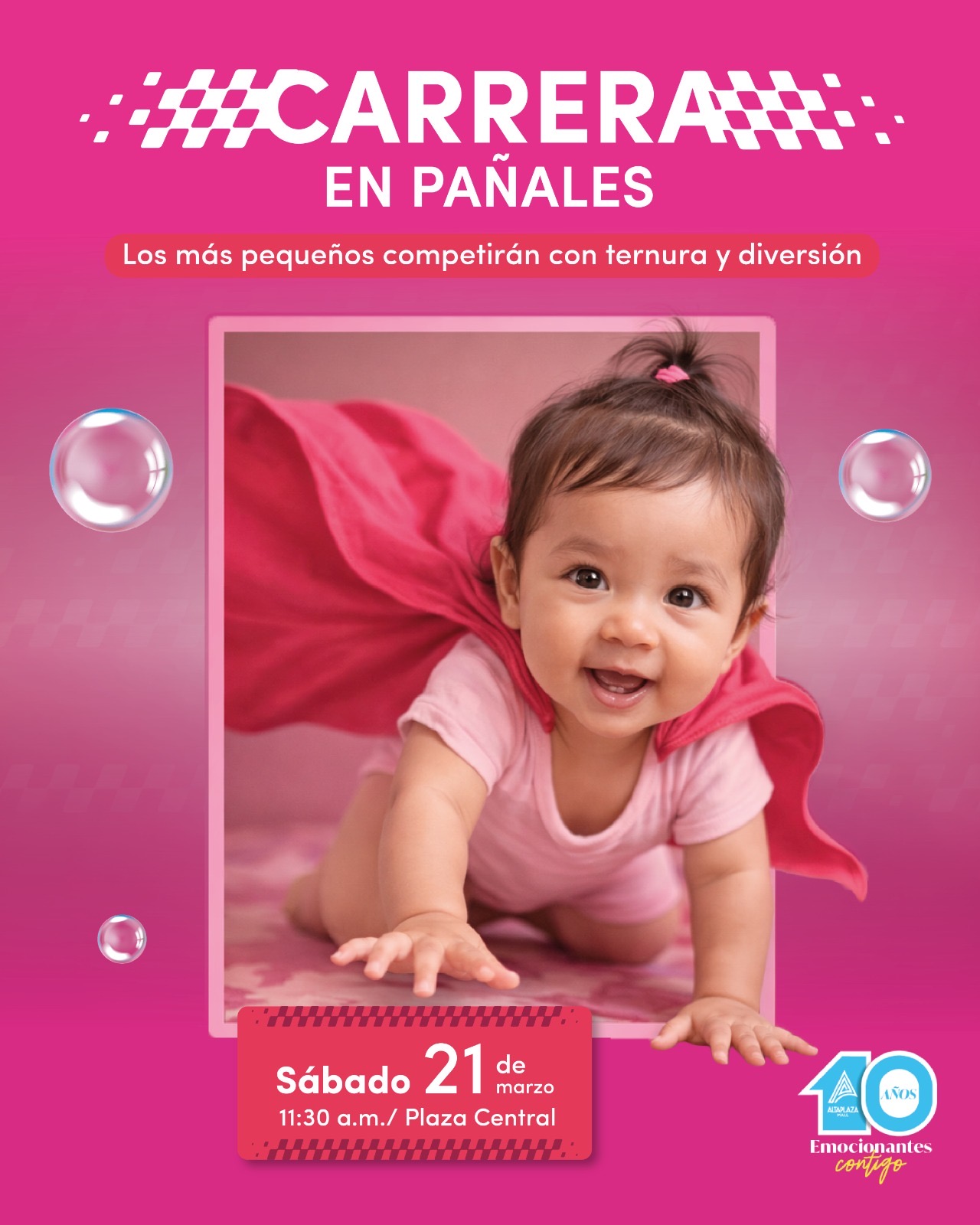 Como parte de la celebración, los sábados, 21 y 28 de marzo, la Plaza Central será el escenario de un ambiente festivo con shows de malabares, zanqueros y música en vivo. El 21 de marzo a las 11:30 a.m., en la Plaza Central se realizará uno de los eventos más esperados, la Carrera en Pañales. En esta divertida actividad, los más pequeños de la casa participarán en una competencia llena de ternura y alegría.