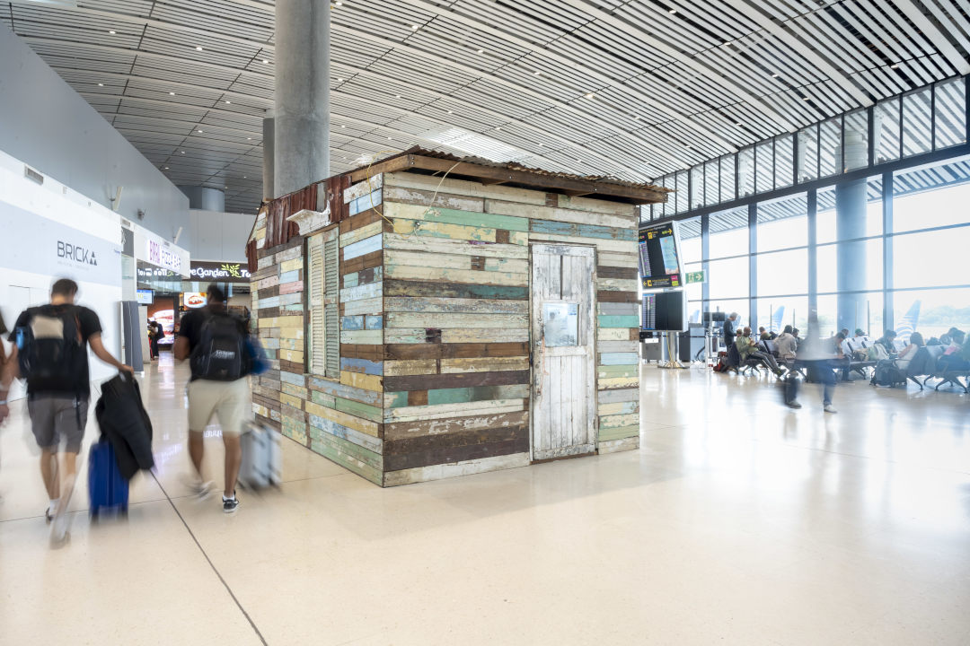 La instalación Inside Outside (2022), de José Braithwaite, está compuesta por madera, zinc y objetos recolectados, con dimensiones variables.